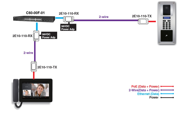 Bộ AETEK EPo2 (Ethernet & Power over 2 wires) cho phép bạn kết nối các thiết bị IP PoE như Intercom/Access Control/Loa/Touch Screen Station/VoIP/Cảm biến/Camera qua mạng Ethernet 2 dây âm tường (dây chuông cửa, dây điện thoại hoặc cáp UTP/STP 1 cặp). Bạn không cần phải cấu hình gì cả, chỉ cần một thiết bị AETEK EPo2 ở mỗi đầu của thiết bị IP PoE (PD) và cổng Ethernet Switch.