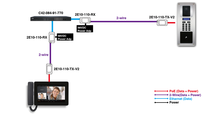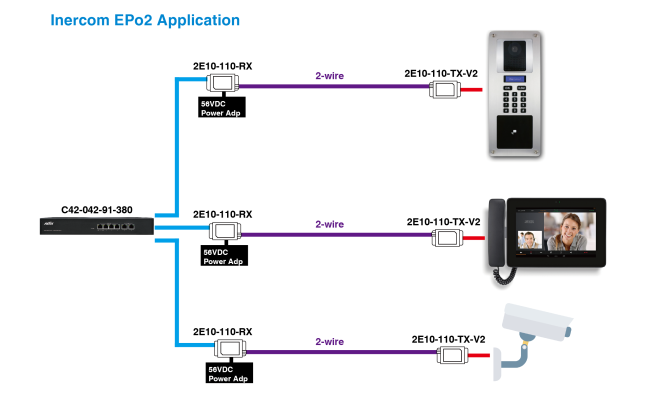 Bộ AETEK EPo2 (Ethernet & Power over 2 wires) cho phép bạn kết nối các thiết bị IP PoE như Intercom/Access Control/Loa/Touch Screen Station/VoIP/Cảm biến/Camera qua dây chuông cửa âm tường, đường dây điện thoại hoặc cáp 2 lõi với mạng Ethernet. Bạn không cần phải cấu hình bất cứ thứ gì, chỉ cần một thiết bị AETEK EPo2 ở mỗi đầu của thiết bị IP PoE (PD) và cổng Ethernet Switch.