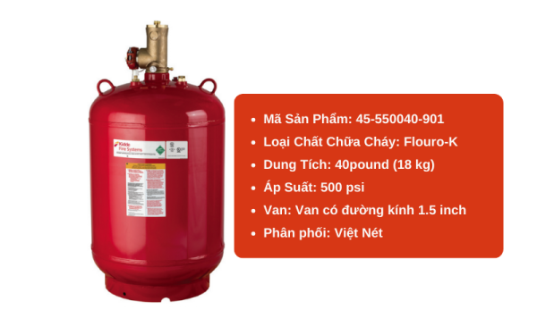 Bình chữa cháy Kidde Flouro-K mã 45-550040-901 là một sản phẩm chuyên dụng được thiết kế để sử dụng trong hệ thống chữa cháy khí Flouro-K. Dưới đây là một số đặc điểm chi tiết của sản phẩm: