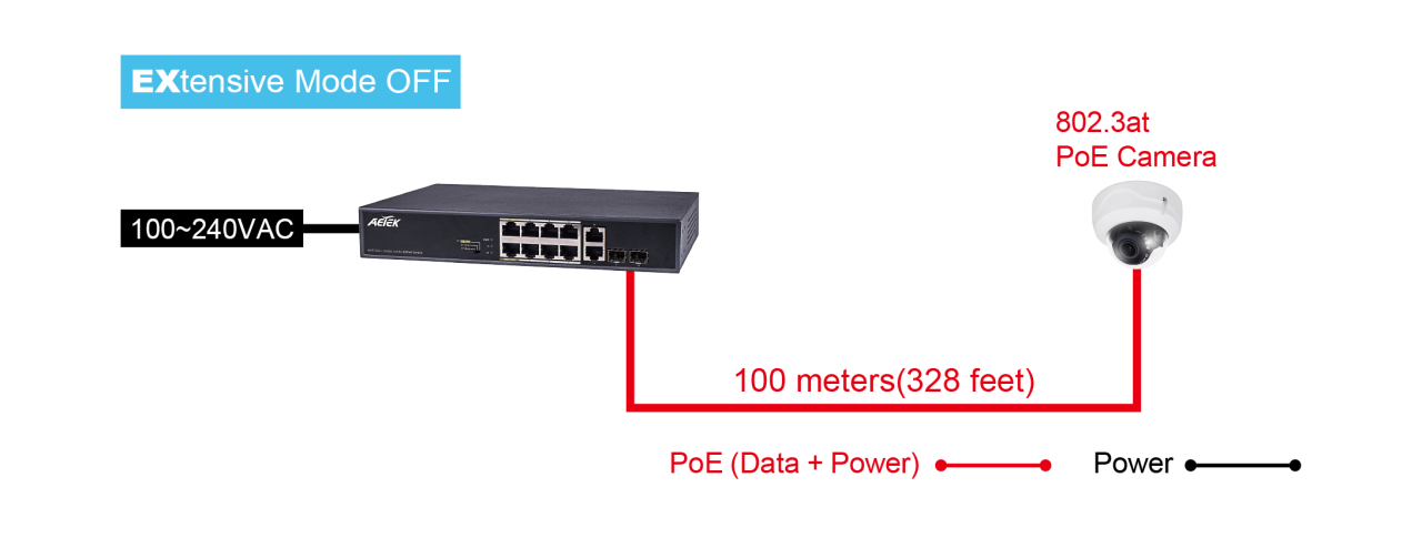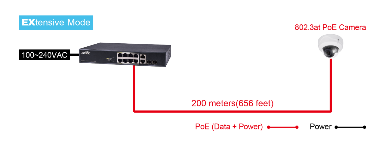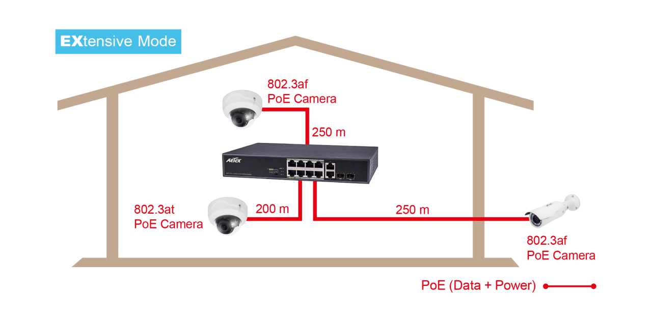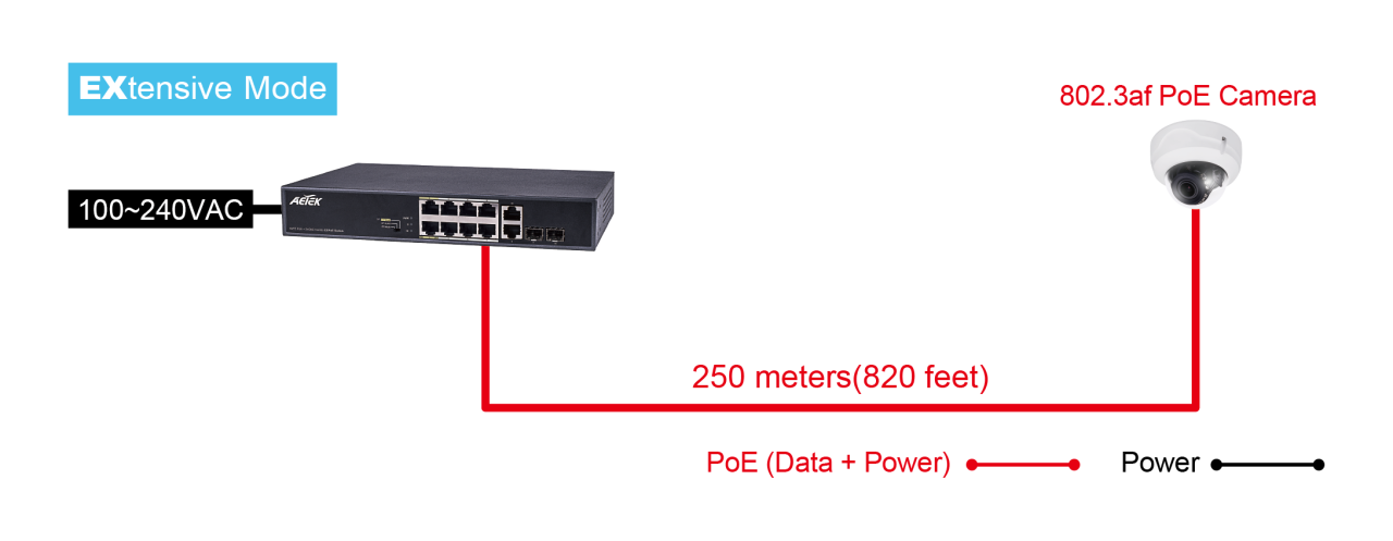 Bộ chuyển mạch EXPoE trong nhà không được quản lý C11-082-32-120 được trang bị công tắc DIP cung cấp chế độ hoạt động EX “EXtensive”. C11-082-32-120 được thiết kế đặc biệt cho ứng dụng Giám sát IP. Bên cạnh các chức năng PoE chuẩn 802.3af/at, chế độ EX cung cấp hình ảnh camera ở khoảng cách cực xa và công suất tối đa lên đến 250m thông qua các cổng EX chuyên dụng cho camera IP PoE tầm xa.