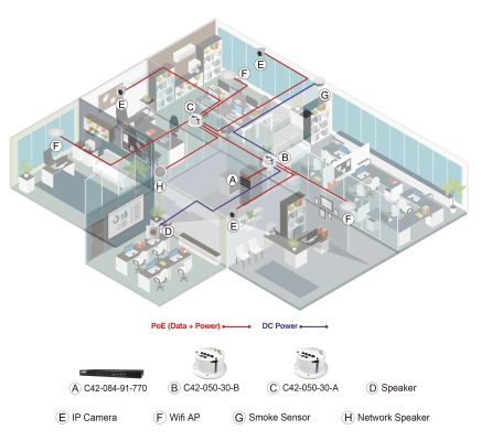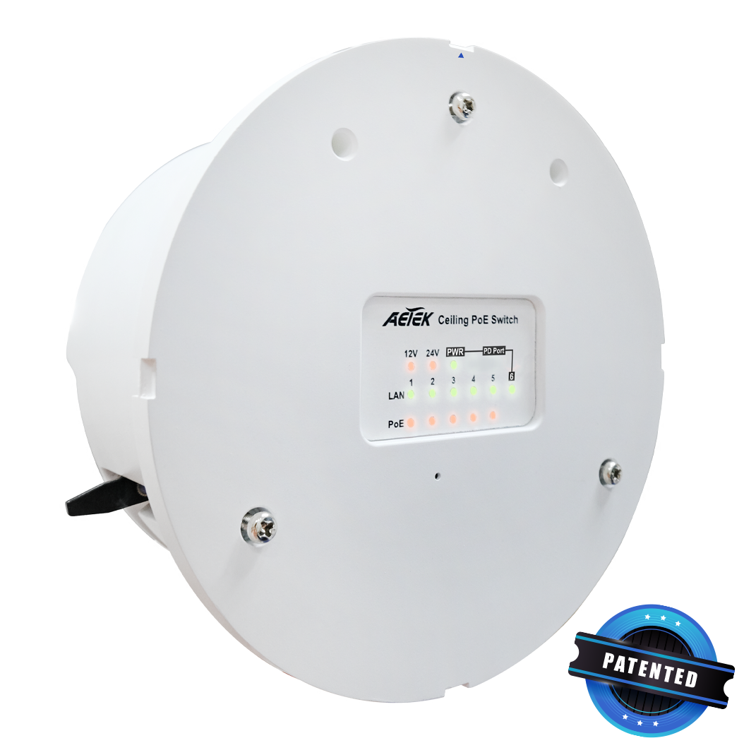 Dòng Switch PoE âm trần C42-050-030 không quản lý của AETEK với một cổng đầu vào PoE PD, năm cổng đầu ra PoE PSE và đèn LED chỉ báo trực quan, mang lại lợi ích từ việc lắp đặt chi phí thấp, chẩn đoán nhanh chóng và triển khai nguồn DC an toàn điện áp thấp. Tính năng PoE chuỗi chéo độc đáo của C42-050-30-B mở rộng phạm vi PoE lên đến 300m qua cáp Cat 5e/Cat 6 mà không cần bộ chuyển đổi nguồn AC/DC bổ sung trên trần. Hơn nữa, C42-050-30-B cung cấp đầu ra DC 12V & DC 24V cho thiết bị DC không phải IP.