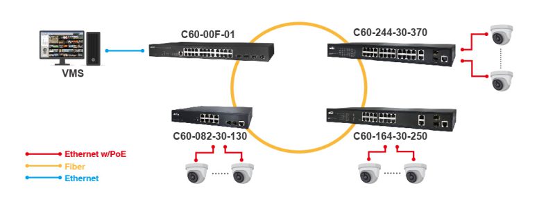 C60-00F-01 cung cấp 24 cổng gigabit RJ45 với 4 cổng 10G SFP+. Bên cạnh một switch NTS L2 Managed Switch, C60-00F-01 còn là một bộ điều khiển camera IP được thiết kế đặc biệt để dễ dàng quản lý và tổng quan các camera IP tuân thủ ONVIF, ngay cả khi người cài đặt không quen với phần mềm nâng cao của switch NTS L2 Managed Switch. Giao diện người dùng đồ họa (GUI) trên web tập trung giúp dễ dàng tìm camera và tự động tạo cấu trúc liên kết khi camera IP ONVIF được kết nối với C60-00F-01. Trong khi đó, người cài đặt có thể dễ dàng nắm bắt thông tin toàn diện về từng camera bao gồm danh sách camera, địa chỉ IP/MAC, cấu trúc liên kết, mức tiêu thụ điện năng và giám sát lưu lượng thông qua trình duyệt web.