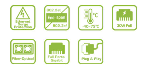 D40 của Bộ chuyển mạch PoE công nghiệp không được quản lý hỗ trợ chống sét lan truyền 6KV cho mỗi cổng Ethernet và cấu trúc được gia cường để đảm bảo hoạt động trong điều kiện thời tiết khắc nghiệt từ -40°C đến 75°C.