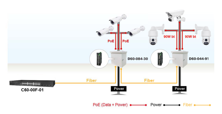Dòng sản phẩm D60 của Industrial L2 PRO PoE Switches được thiết kế với khả năng chống xung sét cổng Ethernet 6KV và tiêu chuẩn tăng cường để hoạt động trong khoảng nhiệt độ từ -40°C đến 75°C trong điều kiện thời tiết khắc nghiệt. Chúng cho phép kết nối các PD PoE ngoài trời với mạng như camera IP ngoài trời, AP không dây và các ứng dụng công nghiệp ngoài trời khác.