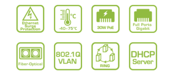 Bên cạnh các chức năng chung của switch L2 như QoS, bảo mật, spanning tree, đo chiều dài cáp và SNMP v1/v2c/v3, giao diện người dùng đồ họa web chuyên dụng của giám sát IP giúp dễ dàng cấu hình và quản lý thiết bị IP. Giao diện này tự động tạo bản đồ cấu trúc mạng, chẩn đoán cáp và quản lý PoE.