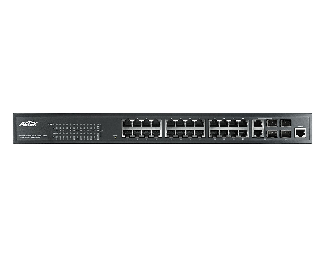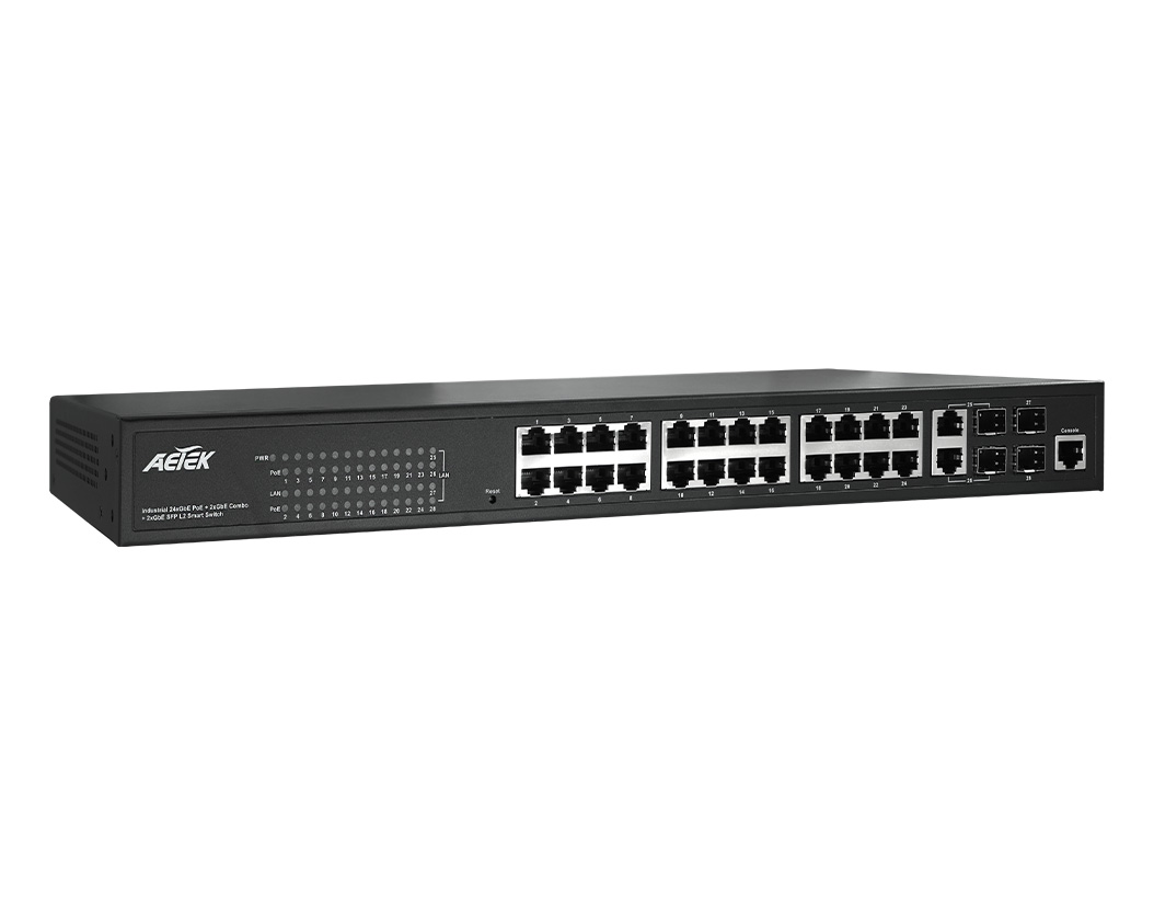 AETEK D60-244-30 cung cấp đa dạng các thiết bị chuyển mạch công nghiệp L2 PRO Gigabit PoE, với 24 cổng Gigabit PoE (10M/100M/1G), 2 cổng Gigabit Combo RJ45/SFP và 2 cổng Gigabit SFP cho kết nối linh hoạt. Thiết bị chuyển mạch này tuân thủ tiêu chuẩn IEEE 802.3af/at, với công suất PoE đủ dùng cho mọi ứng dụng.