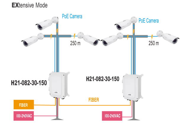 Dòng H21 có hai mô hình phụ bao gồm H21-041-30-075 5 cổng và H21-082-30-150 10 cổng với phạm vi ngân sách công suất từ 75W đến 150W cho giám sát IP ngoài trời.