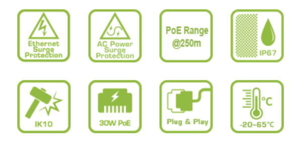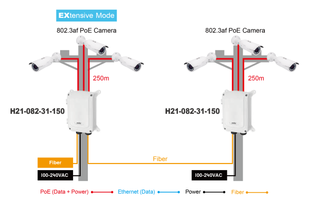 Dòng chuyển mạch EXPoE không được quản lý ngoài trời H21, một thiết bị IP67 / IK10, hoạt động trong môi trường khắc nghiệt từ -20°C ~ 65°C cho ứng dụng Giám sát IP ngoài trời. Bên cạnh các chức năng PoE 802.3af/at chuẩn, chế độ EXtensive cung cấp khoảng cách cực xa về hình ảnh camera và công suất tối đa lên đến 250m thông qua các cổng EXPoE chuyên dụng cho camera IP PoE tầm xa. Trong khi đó, dòng H21 còn có thêm 20% phạm vi dung sai điện áp đầu vào, bảo vệ chống sét lan truyền trên nguồn AC và bảo vệ chống sét lan truyền PoE để ngăn ngừa thiệt hại do nguồn AC không ổn định bên ngoài, sét lan truyền và điện áp tăng đột biến.