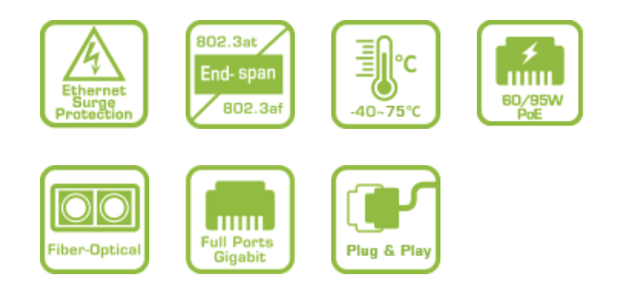 của Bộ chuyển mạch PoE công nghiệp không được quản lý hỗ trợ chống sét lan truyền 12KV cho mỗi cổng Ethernet và cấu trúc được gia cố chắc chắn để đảm bảo hoạt động trong điều kiện thời tiết khắc nghiệt từ -40°C đến 75°C.