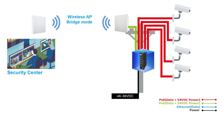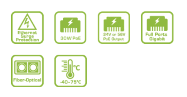 Bộ chuyển mạch có 4 cổng Gigabit PoE và 1 cổng PoE có thể điều chỉnh hỗ trợ PoE thụ động 24VDC hoặc 56VDC, giúp nó cực kỳ linh hoạt để cấp nguồn cho nhiều loại thiết bị — từ camera IP ngoài trời và AP không dây đến các thiết bị công nghiệp khác được cấp nguồn PoE. Ngoài ra, nó còn cung cấp khe cắm bộ thu phát SFP để kết nối uplink cáp quang linh hoạt.