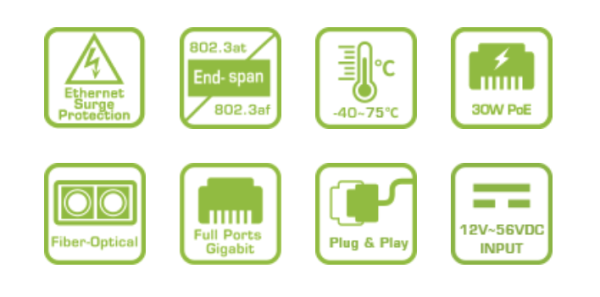 H36-082-30 là Switch PoE công nghiệp Gigabit với đầu vào 12~56VDC, được thiết kế với chuẩn IP30, bảo vệ quá áp cổng Ethernet PoE 12KV và nhiệt độ hoạt động từ -40°C đến 75°C trong điều kiện thời tiết khắc nghiệt. Thiết bị cho phép kết nối các thiết bị PoE PD trong nhà với mạng lưới như camera IP ngoài trời, AP không dây và các ứng dụng công nghiệp khác. H36-083-30 cung cấp 8 cổng Gigabit PoE (10M/100M/1G) truyền dữ liệu và cấp nguồn cho các thiết bị PoE PD qua một cáp mạng duy nhất, cũng như các khe cắm bộ thu phát SFP bổ sung cho kết nối uplink linh hoạt.