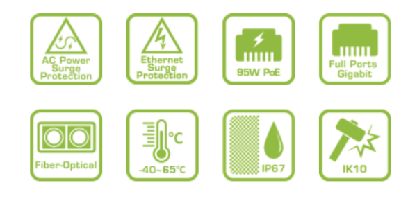 H40-022-90-120 là thiết bị chuyển mạch PoE không được quản lý ngoài trời, hỗ trợ chuẩn IP67, chống sét lan truyền 6KV cho mỗi cổng Ethernet, chống sét lan truyền 10KV cho nguồn AC và kết cấu được gia cường để đảm bảo hoạt động trong điều kiện thời tiết khắc nghiệt từ -40°C đến 65°C.