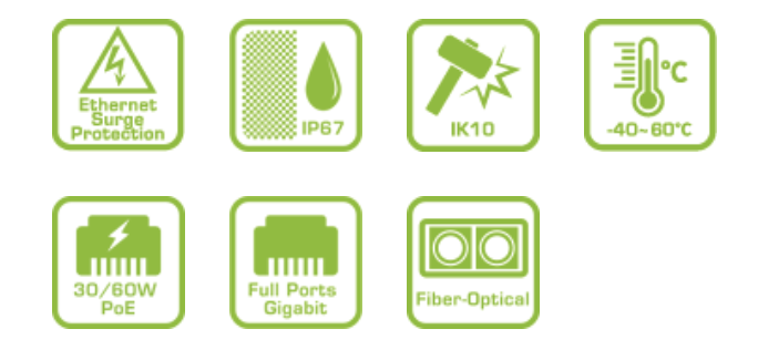 Dòng H40 của Bộ chuyển mạch PoE công nghiệp không được quản lý hỗ trợ chuẩn IP67, chống sét lan truyền 6KV cho mỗi cổng Ethernet, chống sét lan truyền 40KV cho nguồn AC và kết cấu được gia cường để đảm bảo hoạt động trong điều kiện thời tiết khắc nghiệt từ -40°C đến 65°C.