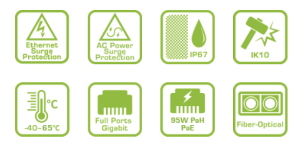 Dòng H40 của Bộ chuyển mạch PoE công nghiệp không được quản lý hỗ trợ IP67, chống sét lan truyền 6KV cho mỗi cổng Ethernet, chống sét lan truyền 40KV trong nguồn AC và kết cấu được gia cường để đảm bảo hoạt động trong điều kiện thời tiết khắc nghiệt từ -40°C đến 65°C.