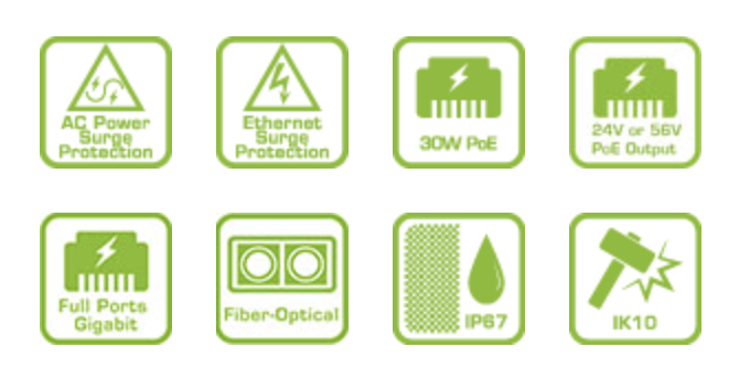 Model này cung cấp 4 cổng PoE Gigabit, mỗi cổng cung cấp công suất lên đến 30W và 1 cổng PoE có thể điều chỉnh hỗ trợ PoE thụ động 24VDC hoặc 56VDC, lý tưởng để kết nối các AP không dây ngoài trời và các thiết bị cấp nguồn PoE thụ động khác. Sản phẩm cũng bao gồm các khe cắm bộ thu phát SFP để kết nối uplink cáp quang linh hoạt.