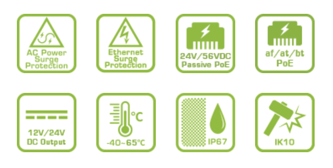 Thiết bị nguồn điện tất cả trong một (PSE) này cung cấp các cổng ra PoE bt 90W, hỗ trợ nhiều thiết bị có công suất PoE cao, bao gồm camera IP PTZ/đa cảm biến, loa mạng, nút không dây, v.v. Đầu ra PoE thụ động 24VDC hoặc 56VDC có thể điều chỉnh độc đáo của sản phẩm mang lại sự linh hoạt để cấp nguồn cho các thiết bị PoE IEEE802.3af và nhiều nút không dây PoE thụ động khác, loại bỏ nhu cầu sử dụng thêm bộ chuyển đổi nguồn. Ngoài ra, đầu ra nguồn DC của sản phẩm cho phép kết nối với các thiết bị không phải PoE, chẳng hạn như bộ định tuyến LTE và đèn LED hồng ngoại.