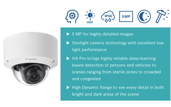 Với độ phân giải 5MP, camera Bosch NDE-5703-A cho phép bạn theo dõi chi tiết tốt hơn và nhận biết rõ ràng hơn về các sự kiện xảy ra trong khu vực bạn quan sát. Độ phân giải cao này giúp tạo ra hình ảnh sắc nét và chất lượng, đặc biệt là trong các tình huống quan trọng.