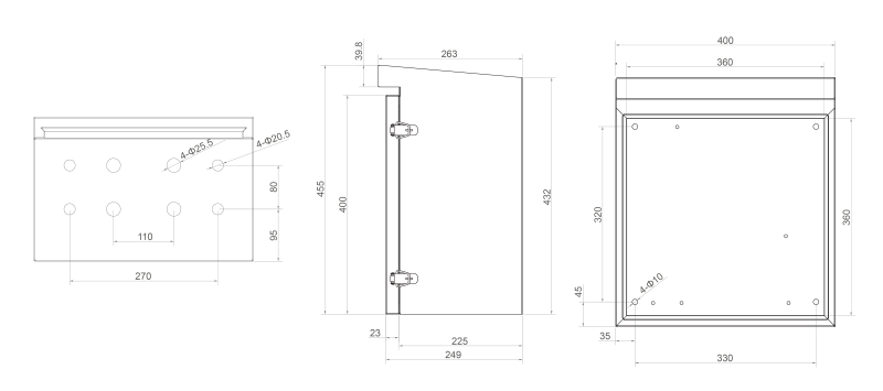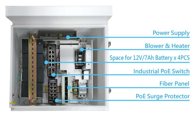 Thiết bị cơ điện cơ bản bao gồm bộ lắp đặt trên tường, đế gắn có thanh ray DIN để lắp đặt công tắc PoE công nghiệp hoặc bộ chống sét lan truyền PoE, bộ ngắt mạch hai cực, thanh nối đất, quạt/máy sưởi có bộ điều chỉnh nhiệt độ, bộ đầu nối cáp và hệ thống nguồn dự phòng.