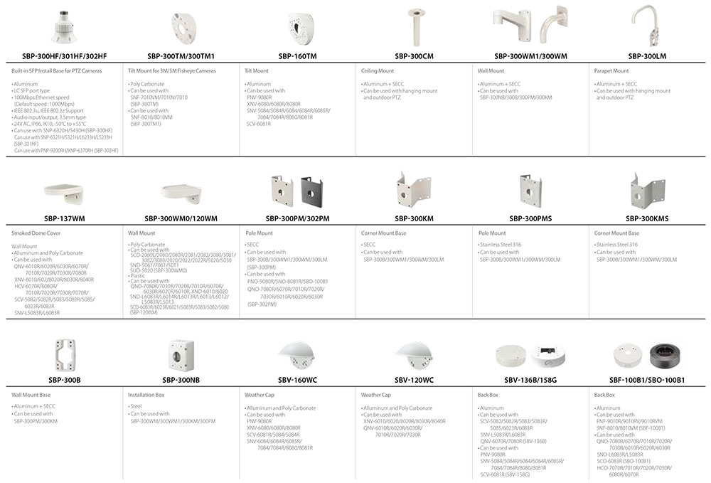 - SBP-300WM0: Wall mount (polycarbonate), for dome camera