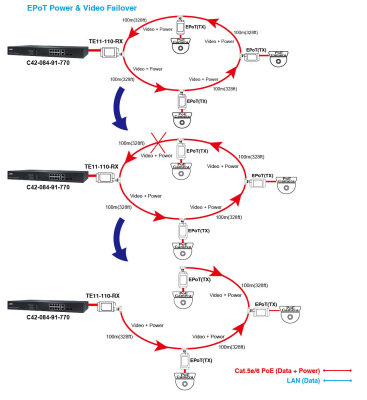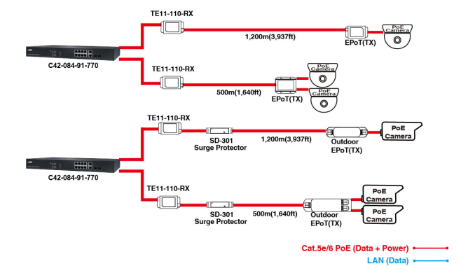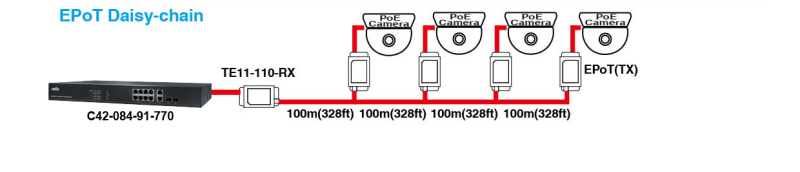 Model tiên tiến này cho phép toàn bộ nguồn điện cho liên kết được cấp từ switch PoE hoặc bộ cấp nguồn PoE. UPoE PSE (>=60W) được khuyến nghị cho giải pháp PoE tầm xa, cung cấp dữ liệu và nguồn điện cho bộ chuyển đổi EPoT TX và camera IP PoE qua cáp đồng trục đơn lên đến 1.200m (3.937ft).