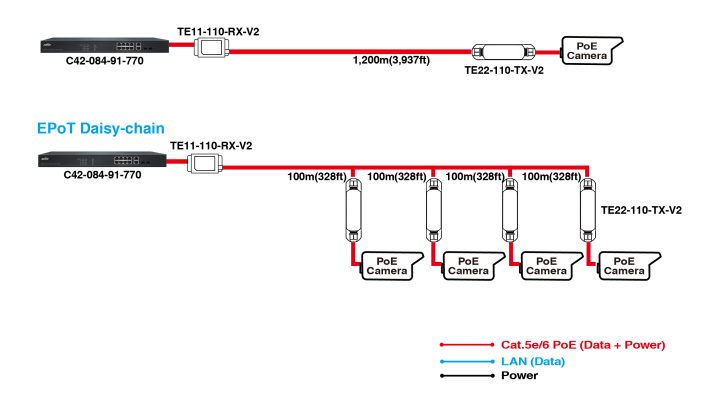 TE22-110-TX-V2, bộ chuyển đổi máy phát (TX) EPoT (Ethernet & Cấp nguồn qua cáp STP/FTP cat5e/6 có vỏ bọc) ngoài trời 1-to-1, được trang bị 1 cổng EPoT và 1 cổng RJ-45 PoE, được thiết kế để kết nối camera IP PoE từ xa qua một cáp STP/FTP cat5e/6 có vỏ bọc mà không cần nguồn điện bổ sung.
