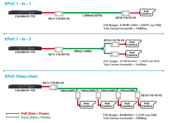 Model tiên tiến này cung cấp dữ liệu và nguồn điện ở khoảng cách xa lên đến 1.200m cho camera IP PoE. Bên cạnh giải pháp PoE tầm xa, XE10-110-TX-V2 thường được sử dụng để nâng cấp hệ thống camera quan sát cũ lên hệ thống giám sát IP PoE mà không cần thay đổi cơ sở hạ tầng cáp đồng trục hiện có.
