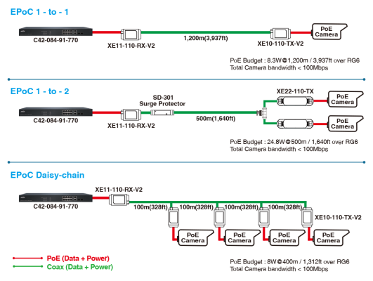 PoE IEEE 802.3bt 90W được khuyến nghị cho giải pháp PoE tầm xa, cung cấp dữ liệu và nguồn điện cho bộ chuyển đổi EPoC TX và camera IP PoE qua cáp đồng trục đơn lên đến 1.200m (3.937ft). Bên cạnh giải pháp PoE tầm xa, XE11-110-RX-V2 cũng thường được sử dụng để nâng cấp hệ thống CCTV cũ lên hệ thống giám sát IP mà không cần thay đổi cơ sở hạ tầng cáp đồng trục hiện có.