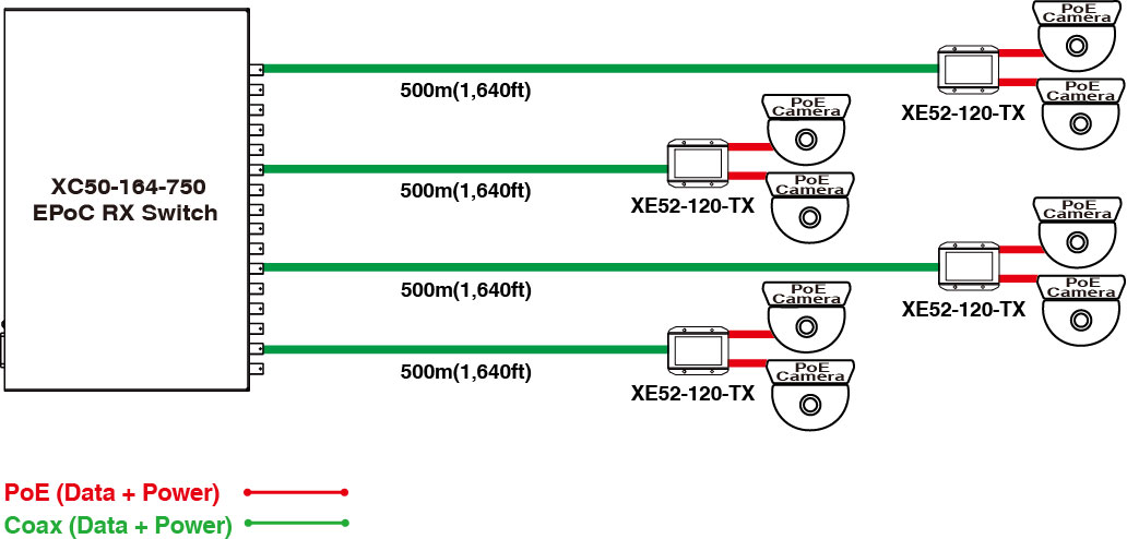 XE52-120-TX, bộ phát (TX) 1-to-2 EPoC (Ethernet & Cấp nguồn qua cáp đồng trục) được trang bị 1 cổng BNC và 2 cổng PoE switch, được thiết kế để kết nối 2 camera IP PoE từ xa qua cáp đồng trục đơn mà không cần nguồn cấp bổ sung. Model tiên tiến này cung cấp dữ liệu và nguồn điện ở khoảng cách xa lên đến 500m với công suất PoE 25W cho 2 camera IP PoE từ xa. Bên cạnh giải pháp PoE tầm xa, XE52-120-TX thường được sử dụng để nâng cấp hệ thống CCTV cũ lên hệ thống giám sát IP PoE mà không cần thay đổi cơ sở hạ tầng cáp đồng trục hiện có.